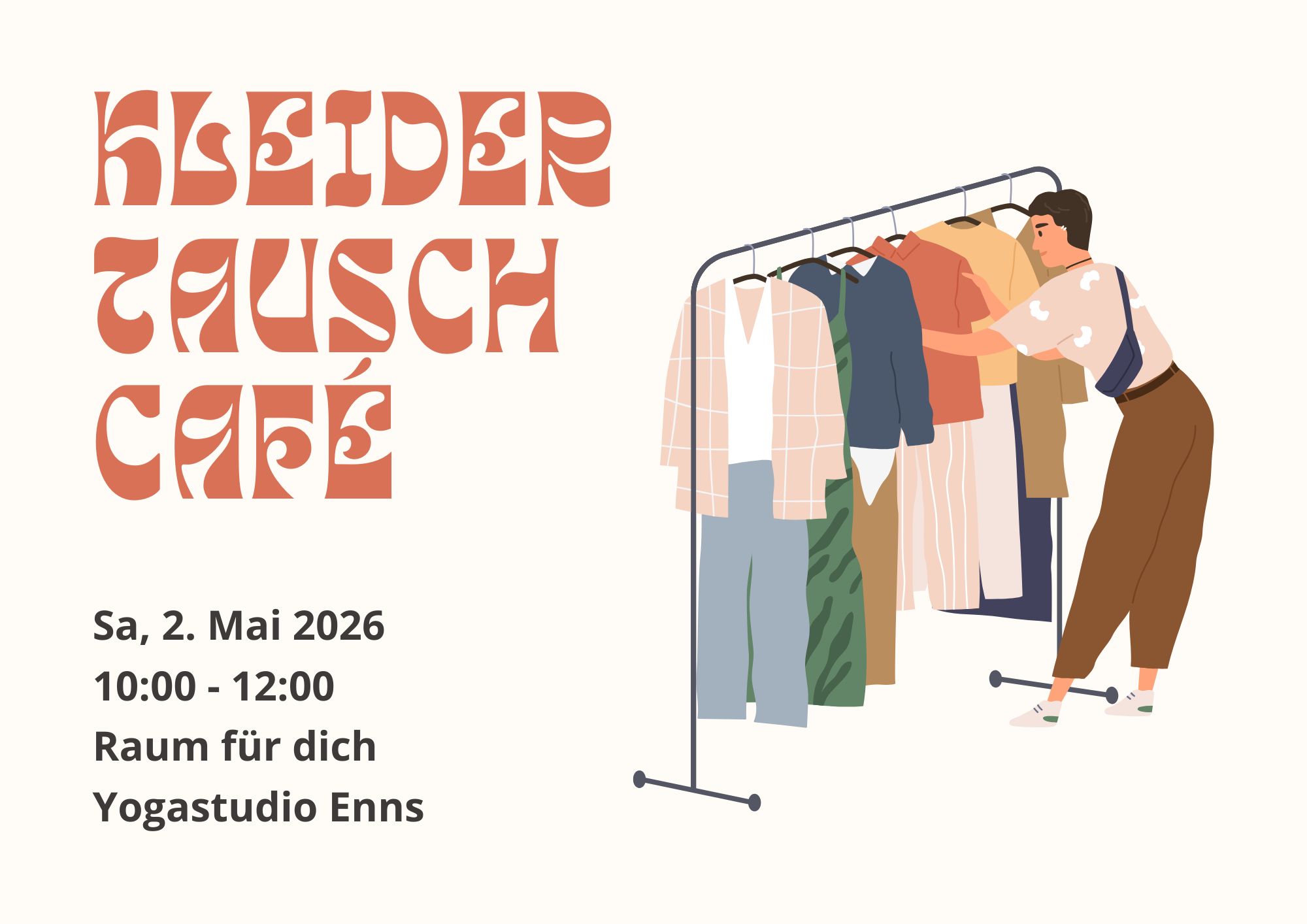 Bitte bringe 3-10 Kleidungsstücke zum Tauschen mit. Alle Kleidungsstücke, die übrig bleiben und du spenden möchtest, bringen wir zum Volkshilfe Shop in Enns.